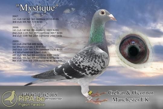 奥秘(Mystique), 我们要从哪里开始介绍这羽特别的鸽子呢?这羽雌鸽赢得了14项冠军,其中包括超过4000羽比赛的冠军,她获得了2010赛季区赛鸽王,还有2010年全英鸽王亚军、雌鸽组冠军。这羽雌鸽最早繁育的4羽幼鸽中的3羽获得冠军,约翰认为她将会成为以后让他保持顶级水平的重要种雌。