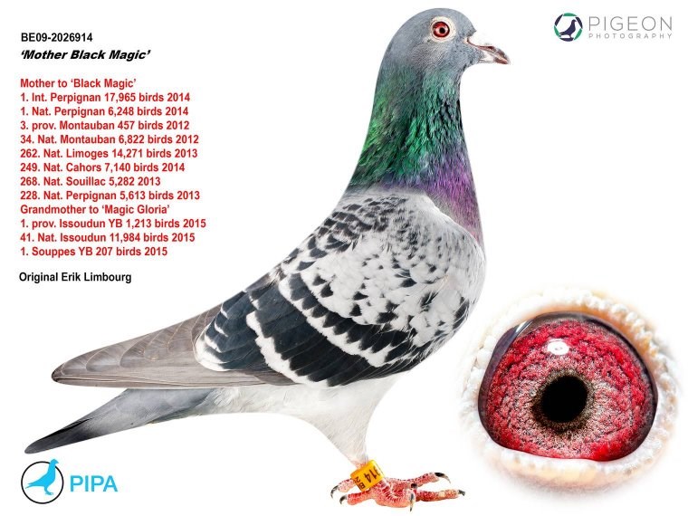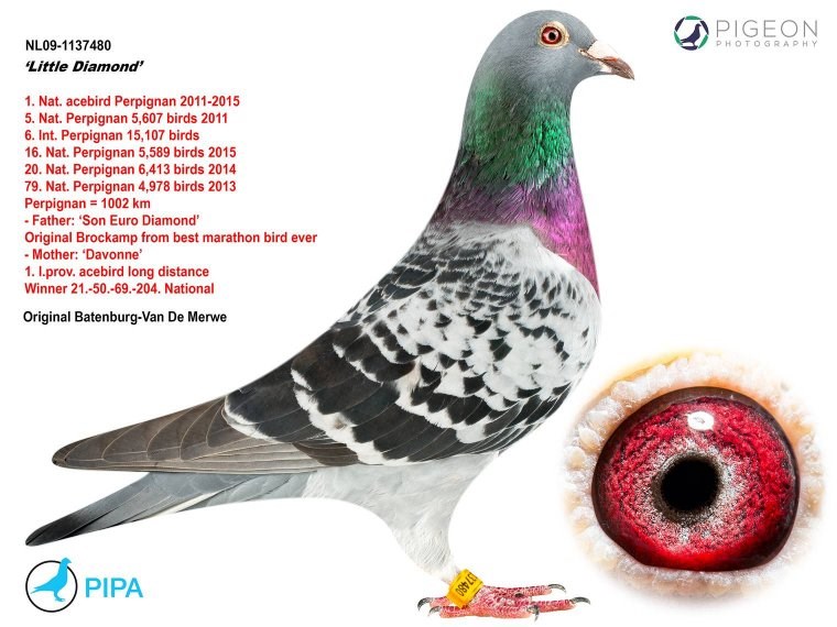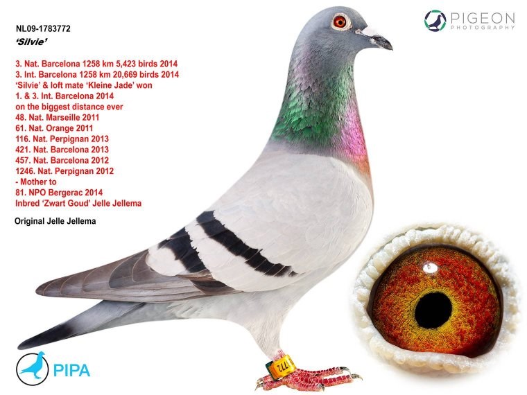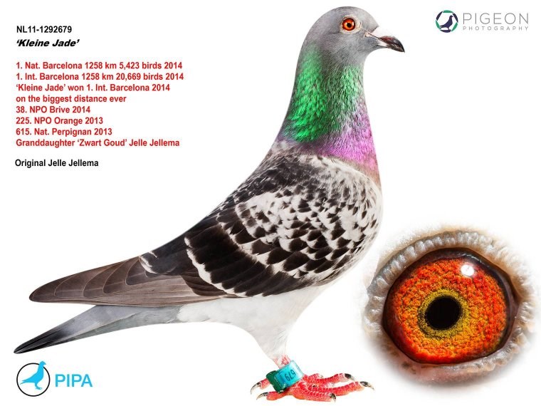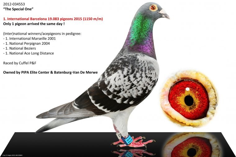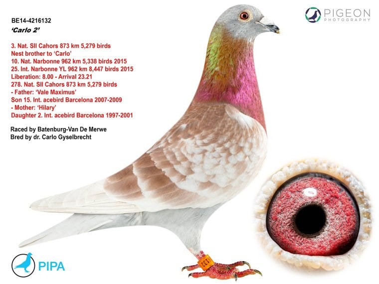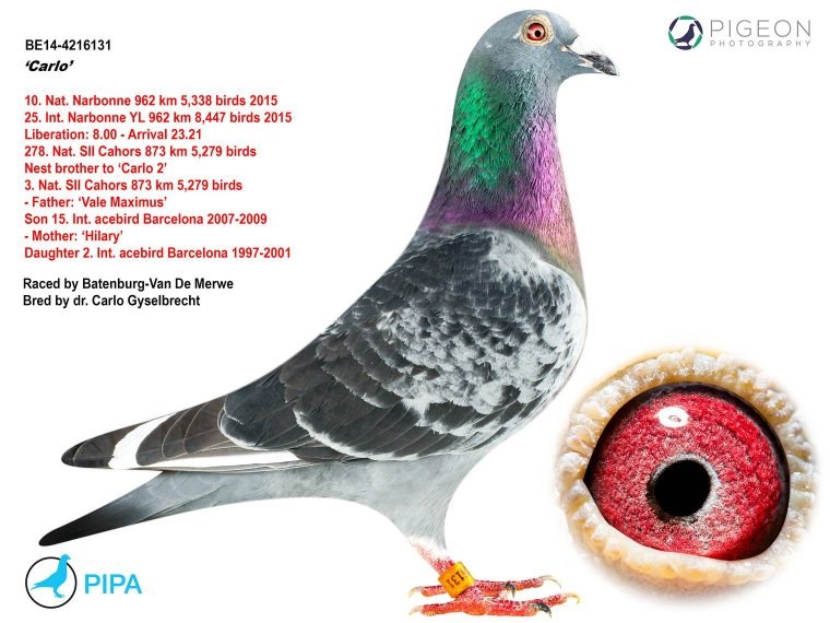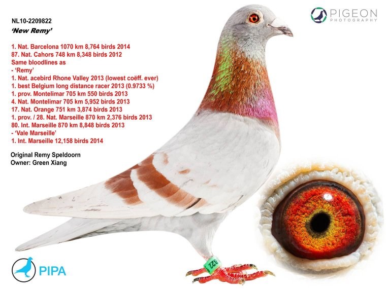 而另外一羽没有远走亚洲的巴塞罗那国际冠军就是来自吉塞布赖特家族的“巴塞罗那荣耀号”(Laureaat Barcelona BE92-4428350),他们赢得了巴塞罗那国际赛20925羽冠军(这也是最艰苦的巴塞罗那赛之一,只有3羽赛鸽分速超过1000米/分,国际赛第4位落后“巴塞罗那荣耀号”90分钟)…他的直孙女就是“新荣耀号”的母亲,由卡罗.吉塞布赖特医生作育,作为礼物送给“新荣耀号”的使翔者卢克.威尔斯(Luc Wiels),而“巴塞罗那荣耀号”也是卡罗医生作育的。