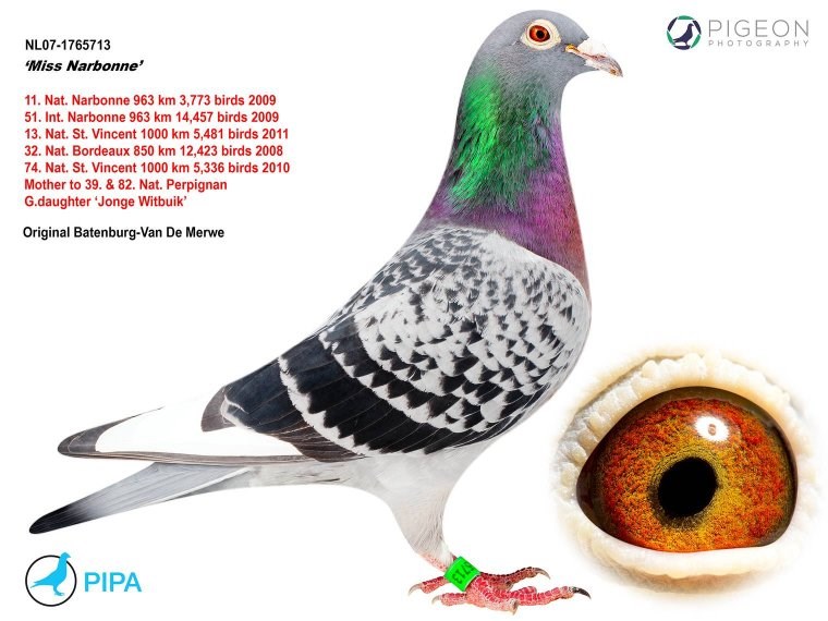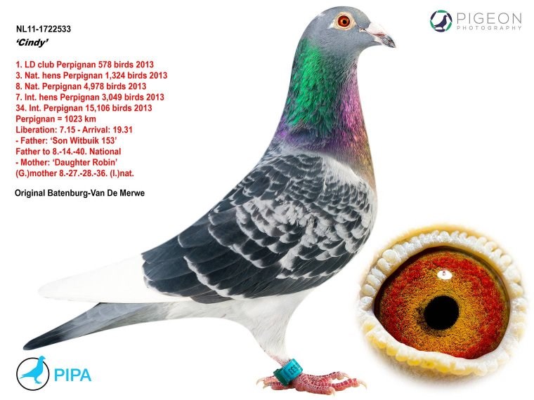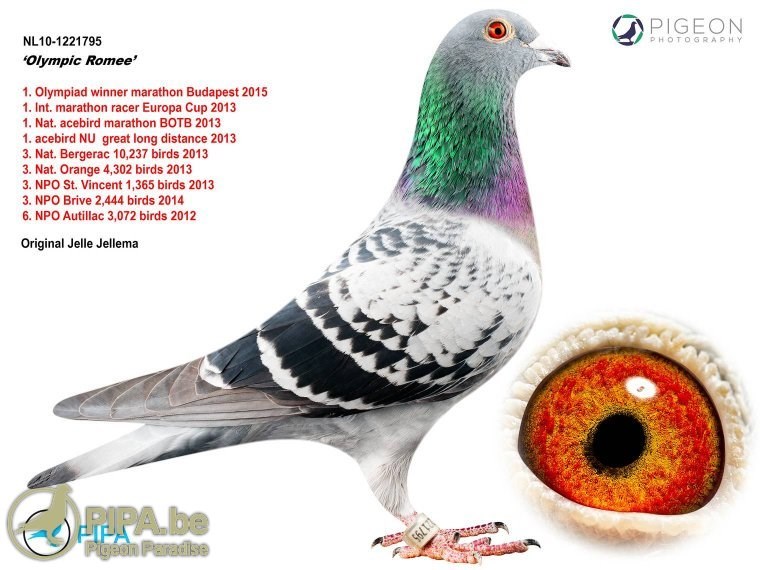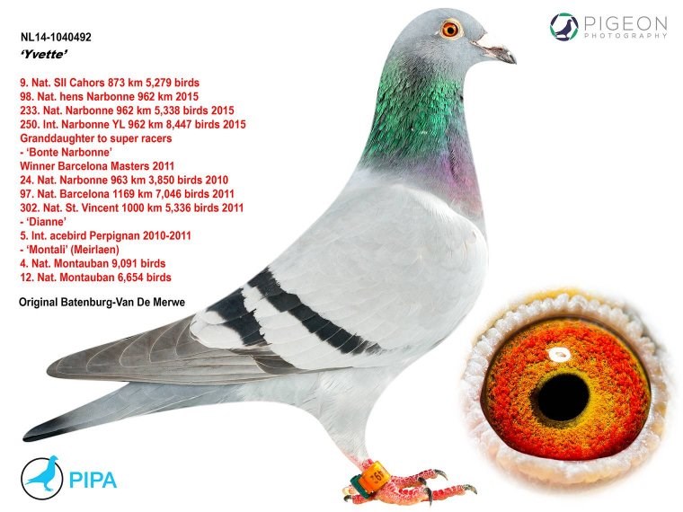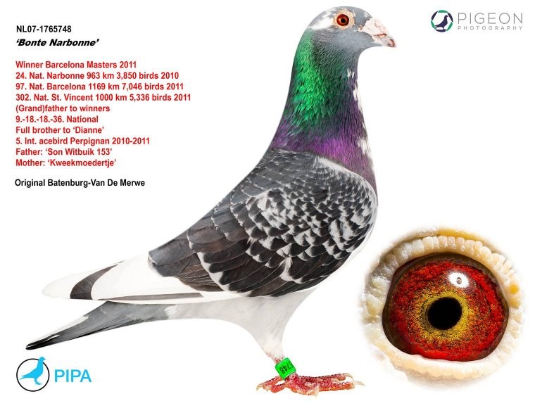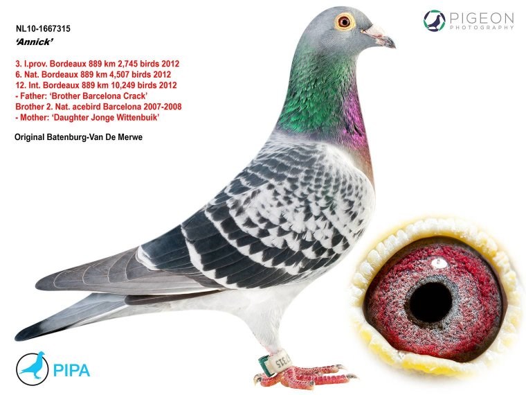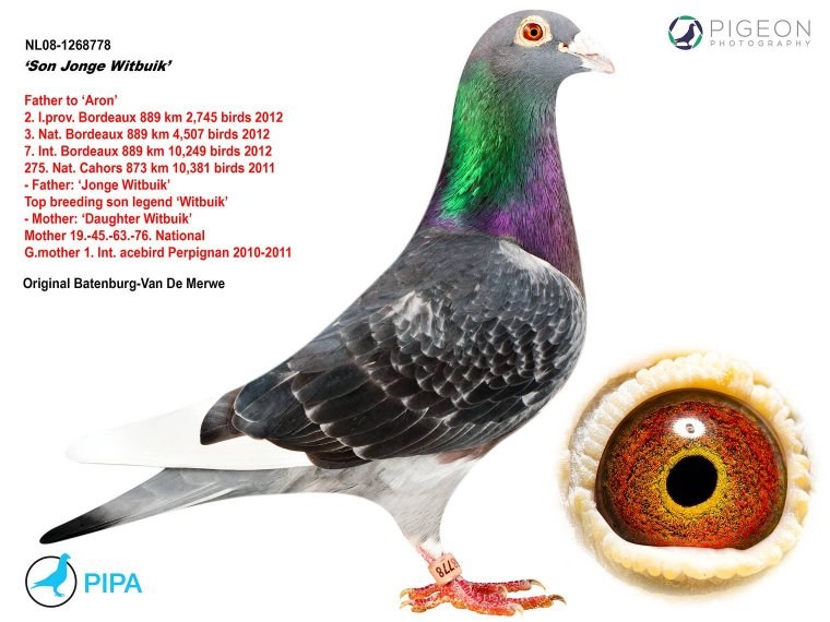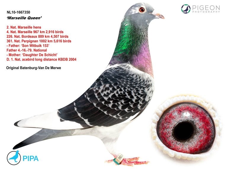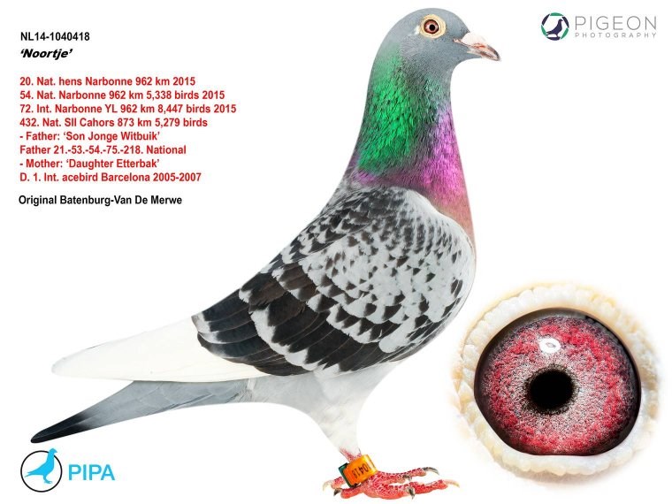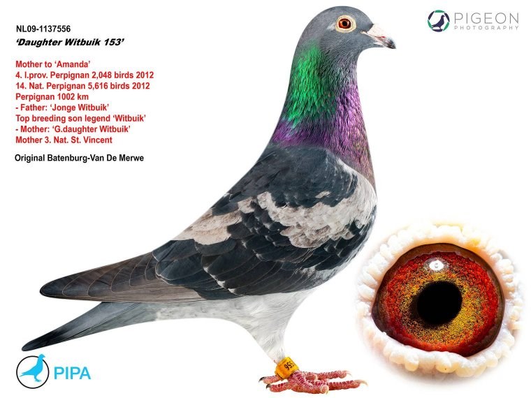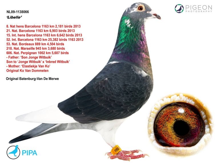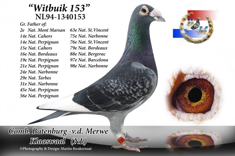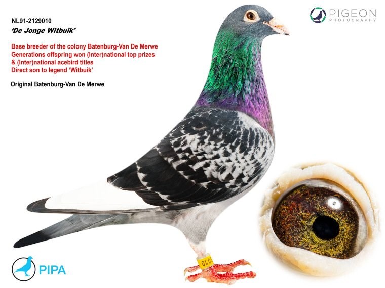 这羽超级种公就是著名的“白腹号”(NL81-1533120 De Witbuik)。这羽杨阿腾种公成为世界上最著名的种鸽之一。