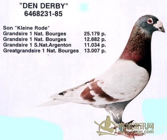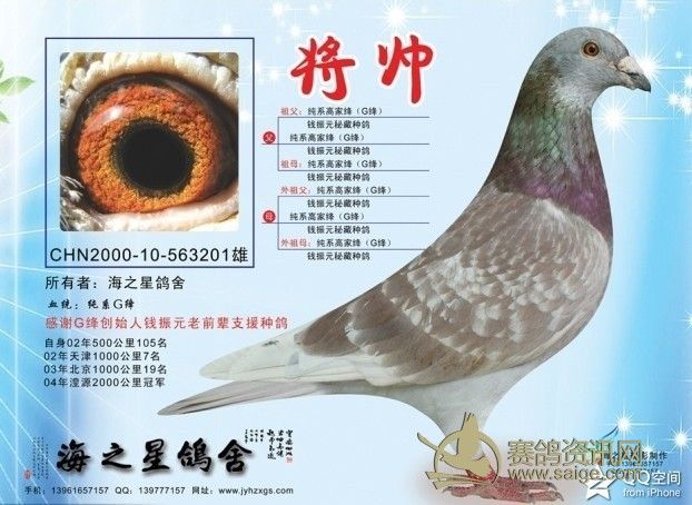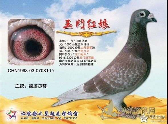 这只是说的一般情况,有一般就有特殊。这个特殊我举个例子是:赛鸽天地的第66期,彩页广告的部分,有湘闽鸽舍登的赛鸽,铁翼飞奴,CHN32-2006-628557是红轮黄眼雌鸽。其父是剑客金公CHN2000-001836,雨点白条砂眼,其母是湘闽303,CHN18-2004-000303,绛砂眼。这里面有两个特殊,第一,按说绛母配非绛公出的子代绛鸽应该是公,而铁翼飞奴却是个在湖北中佳公棚决赛4名的雌鸽。第二个特殊,我在网上看到过无数次几个高手名家抬杠,基本大多数鸽友认为黄眼配黄眼可以出砂眼,而砂眼配砂眼不可能出黄眼,而铁翼飞奴的父母都是砂眼,铁翼飞奴却是黄眼。其实这个配对还有一个不一般,父亲是偏深的雨点白条,母亲是绛雨点,铁翼飞奴却是红轮。