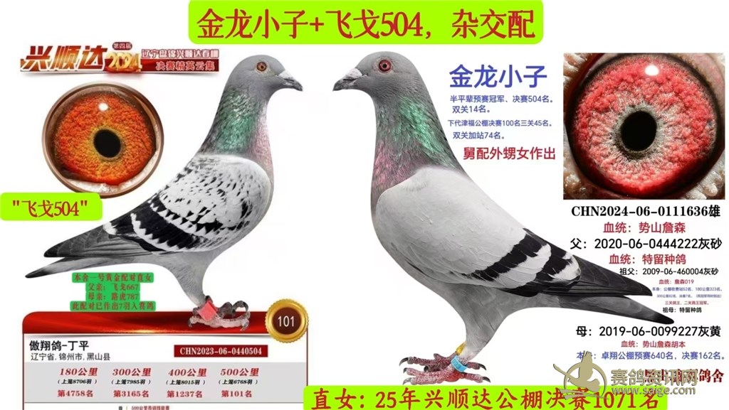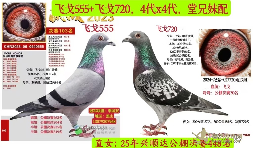 448名的母亲:飞戈720,血统鸽,全兄:飞戈558,公棚决赛30名,全兄:飞戈632,公棚加站5名,它们的父亲是飞戈601,,本身:180公里451名、304公里237名520公里、决赛693名、加站530公里112名,后者也是本舍一号黄金对直子。
