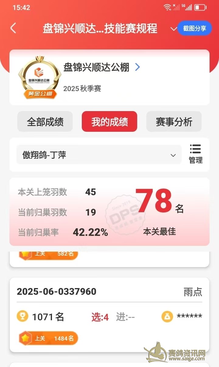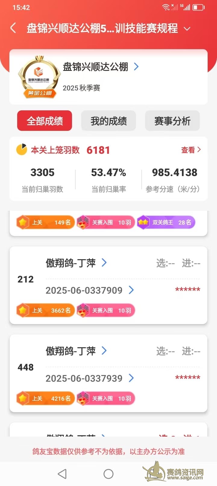 昨天,辽宁盘锦兴顺达公棚决赛,本舍上笼6羽,入赏3羽,分获:212名、448名和1071名。