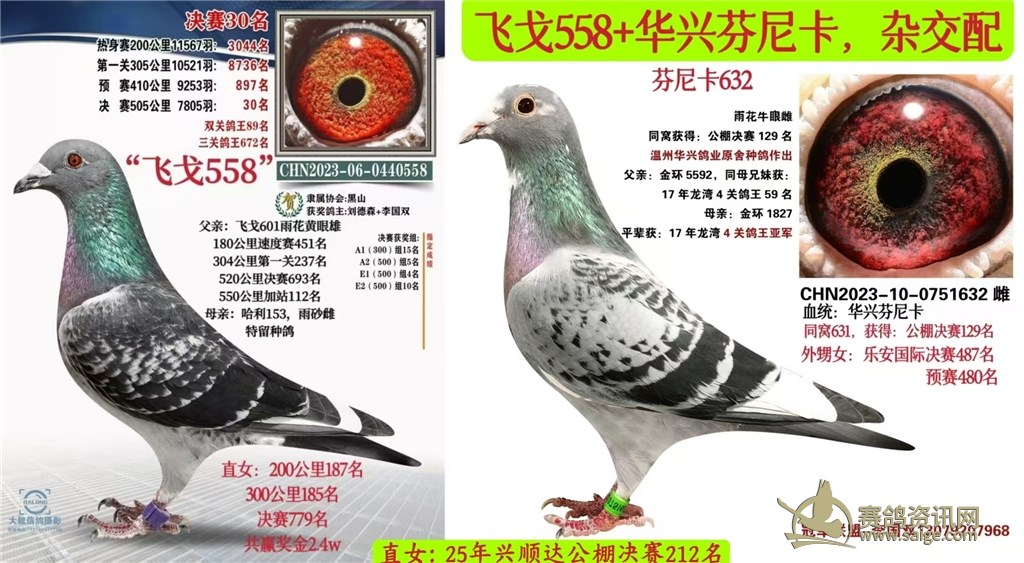 212名,父亲是:飞戈558,公棚决赛30名,直女:飞戈708,雨沙雌, 本身180公里187名,300公里185名,520公里决赛779名。