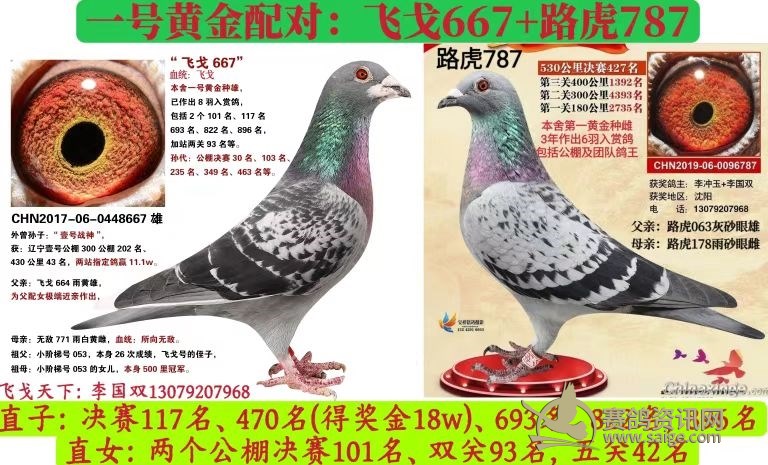 448名的父亲:飞戈555,本身公棚决赛103名,(半)平辈:公棚决赛235名、349名、463名、1241名,加站204名。祖父:本舍钻石种雄,飞戈021,本身:公棚预赛35名,决赛117名,已作出6羽入赏鸽,本舍黄金对直子。