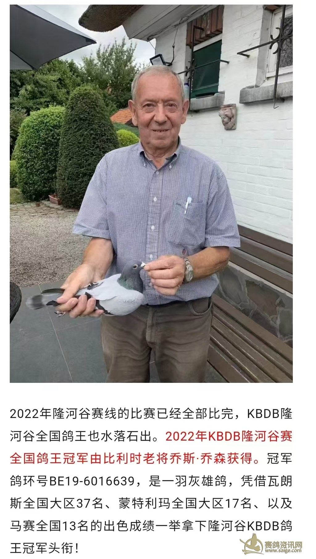 对这个老先生以前或多或少也有点儿了解吧,其鸽舍主要血统是休斯肯·冯莱尔鸽系,他的基础种鸽叫“帮家”。