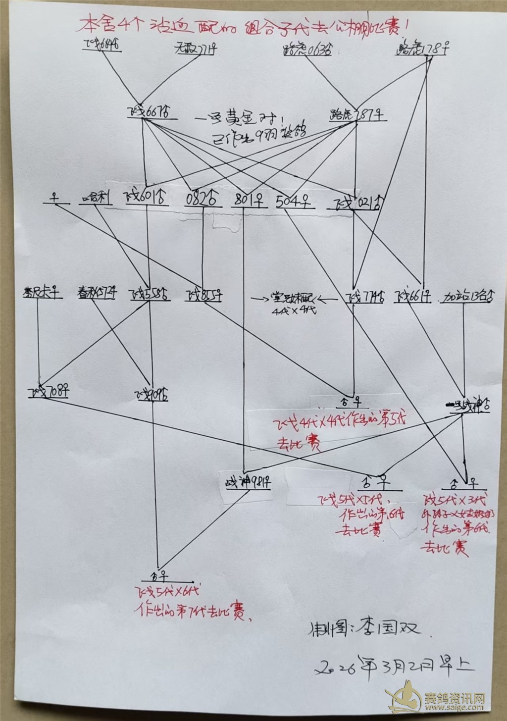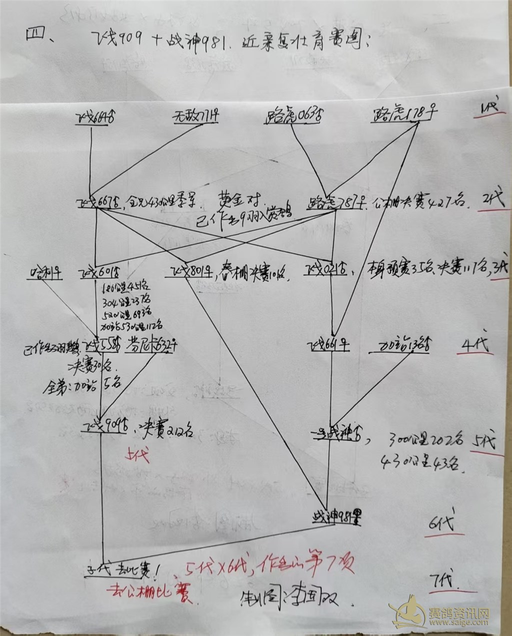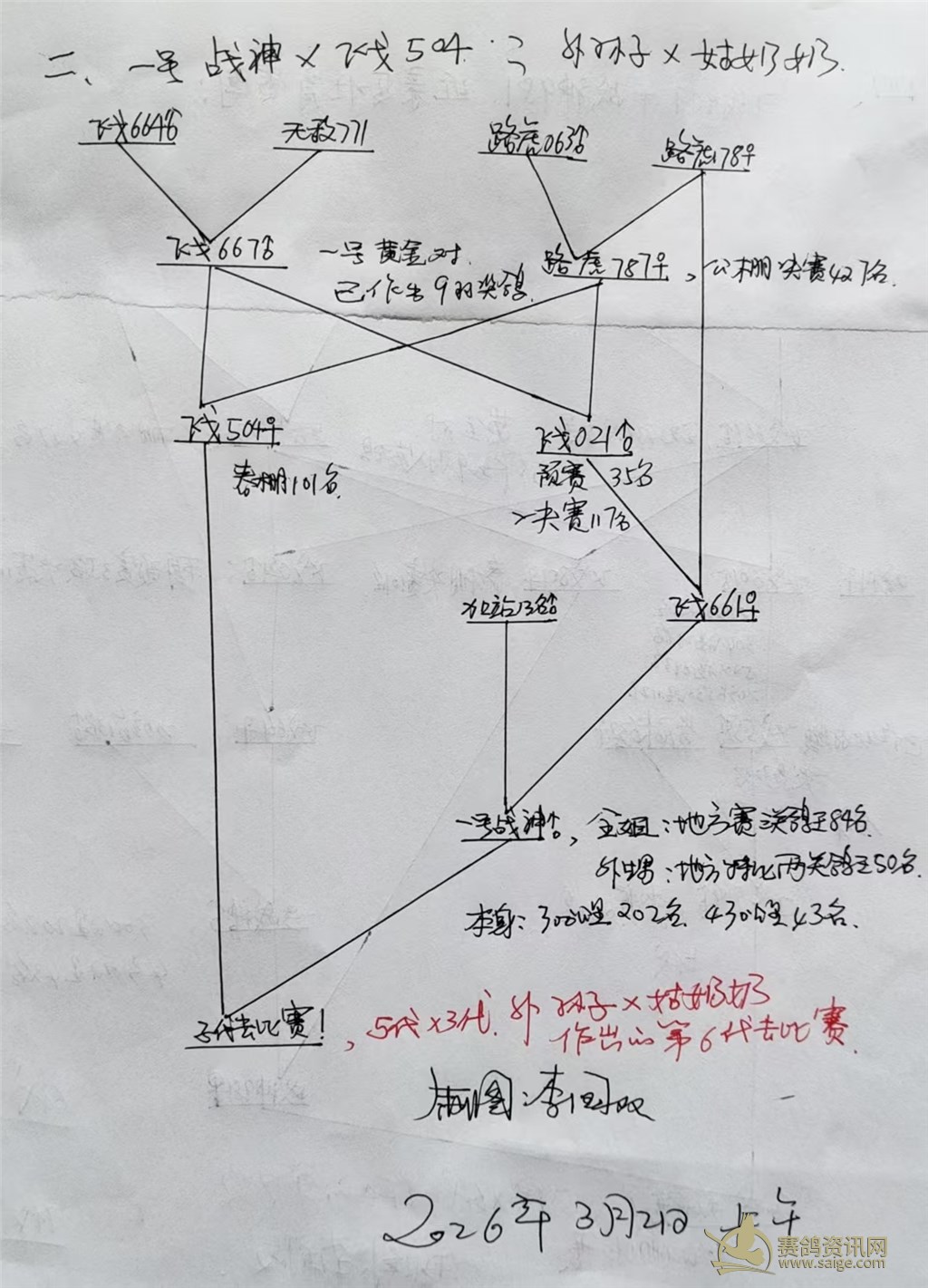 它们的父亲:飞戈558是公棚决赛30名,祖父:飞戈601是180公里451名、304公里237名、决赛693名,加站赛112名,孙女飞戈708的成绩和它祖父类似,难道是隔代遗传吗?!