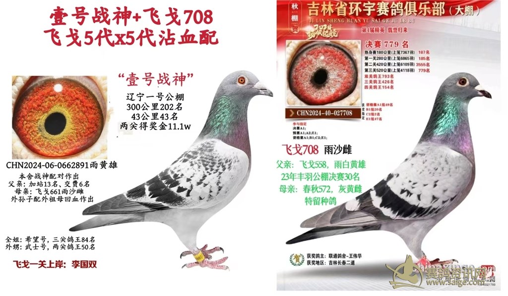 飞戈708,也是连续两关快的选手,180公里飞187名、300公里飞185名,决赛飞779名,同父半弟公棚决赛212名,同父半妹公棚加站187名。