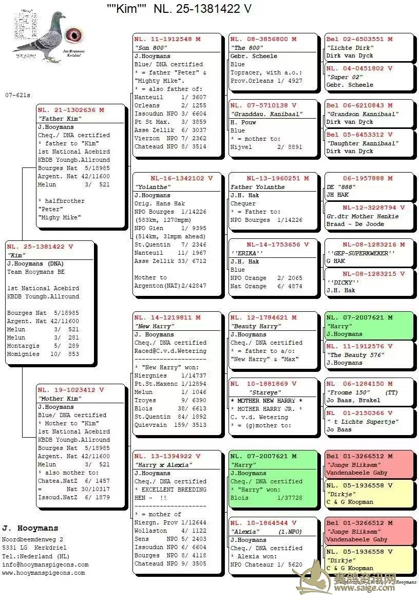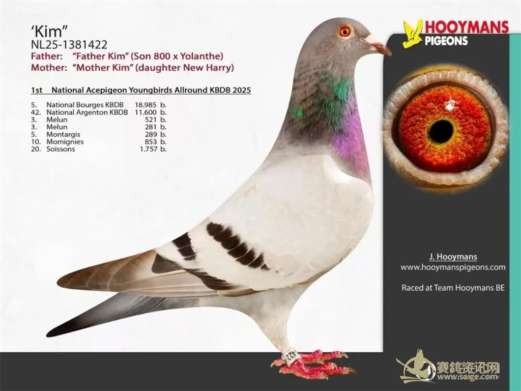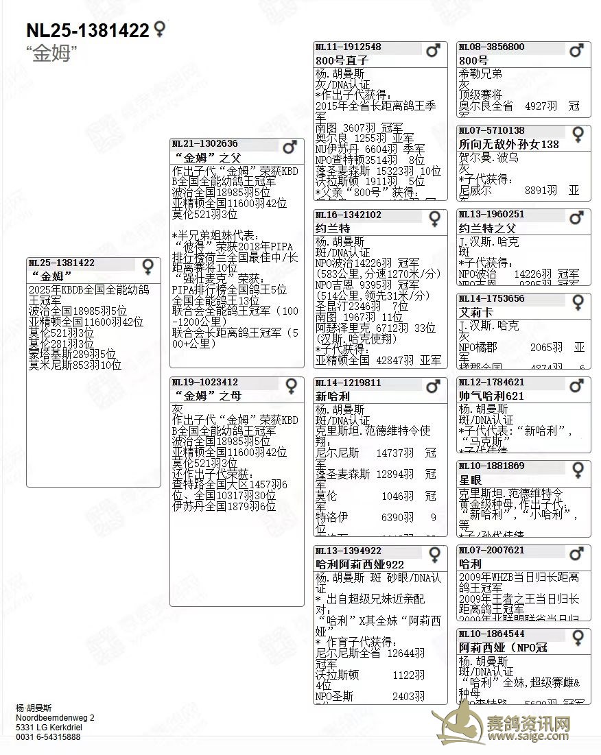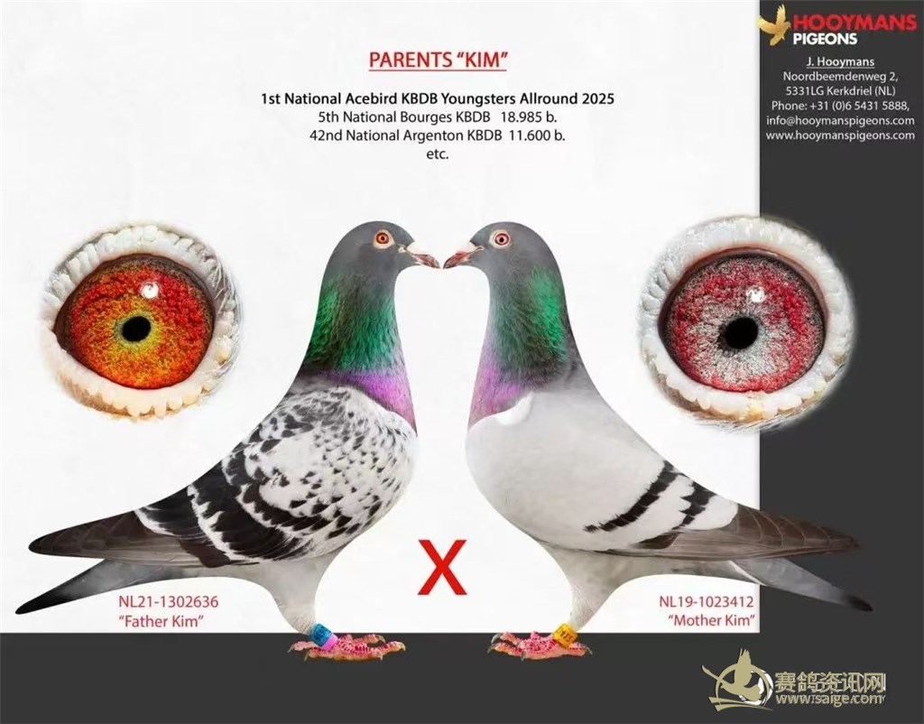 2024年,荷兰赛鸽名家杨·胡曼斯(Jan Hooymans)凭借“柯丽”(Corrie),以史上最低系数斩获 KBDB 全国大中距离一岁鸽王冠军。2025年再凭 “金姆”(Kim)拿下 KBDB 全国全能幼鸽王冠军,实现鸽王冠军两连冠。两羽冠军鸽均为 “新哈利” 外孙女。新科鸽王冠军“金姆”,是一羽极具智慧的灰黄眼雌鸽。父亲NL21-1302636,雨点黄眼雄,源自迪克·凡戴克“所向无敌”与汉斯·哈克两大顶级鸽系。母亲NL19-1023412,灰砂眼雌,出自“新哈利”配“哈利”与“阿莉西娅”的直女,采用“哈利”直孙配直女的极致近亲作育手法,最大化保留了核心血系的优良特质。