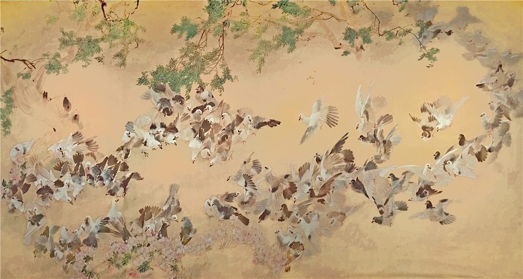 《百鸽图》是世界和平的标志,是张书旗1940年在重庆创作的,被献给美国总统罗斯福的,庆贺他第三次连任。 在我国的传统绘画中,画鸽有着悠久的历史,早在敦煌壁画中已出现了。