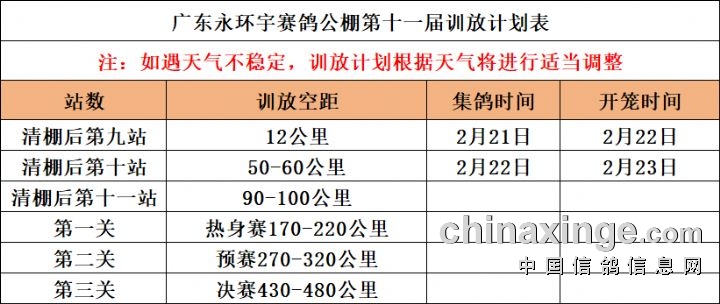 广东永环宇赛鸽公棚清棚后第十站50-60公里定于2月22日集鸽,2月23日训放,连扫2天,训放数据网上直播、快手直播号:YHY13229999977(不排除漏扫及电子环损坏,本次归巢有短信通知,望各位鸽友们悉知)。