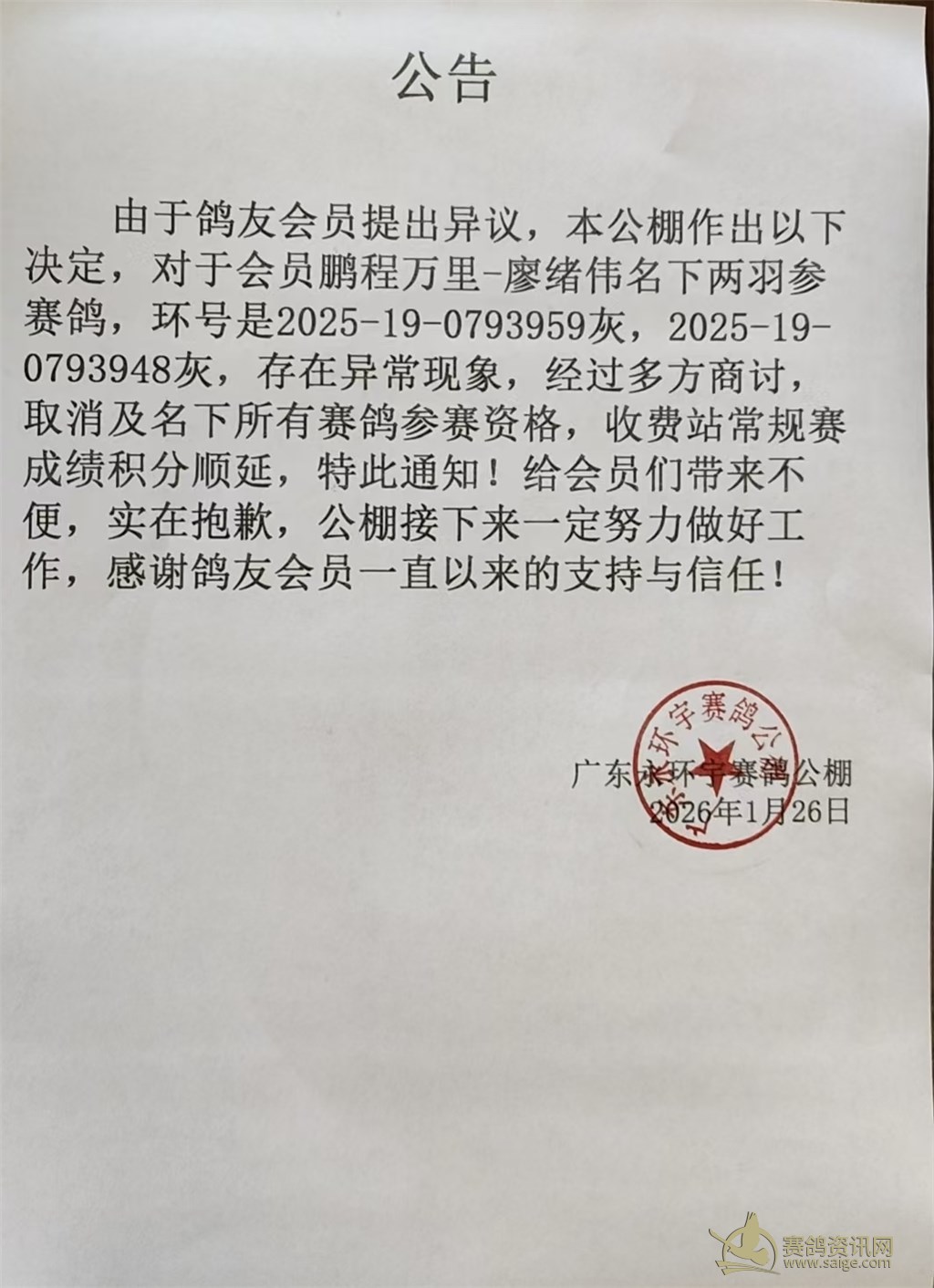 广东永环宇赛鸽公棚收费站常规赛成绩名单(公示期两天无异议自动成效)