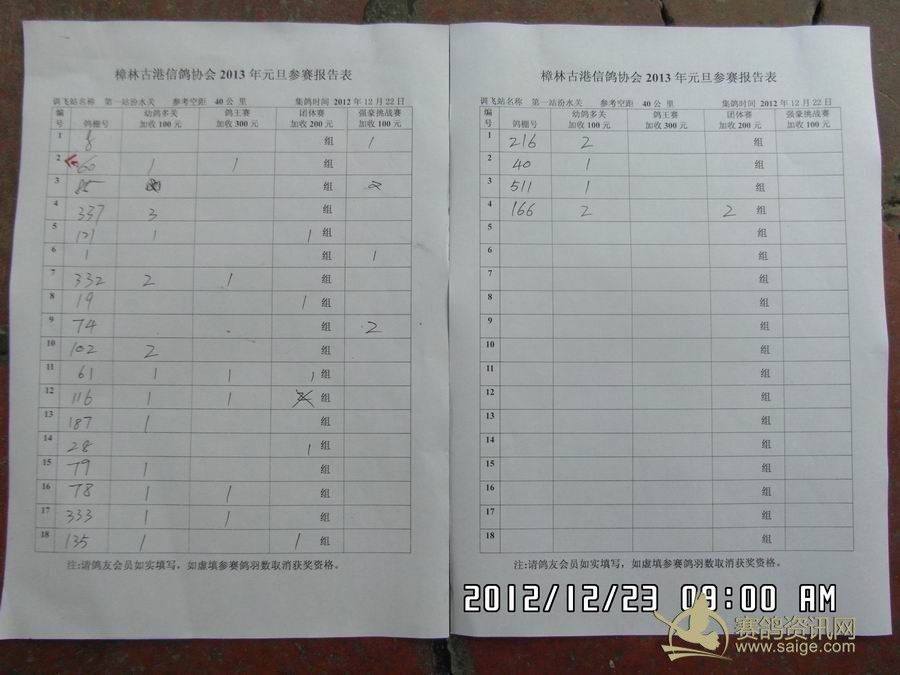 樟林古港信鸽协会2013元旦第一站幼鸽多关.鸽王.团体赛.强豪挑战赛参赛报告表