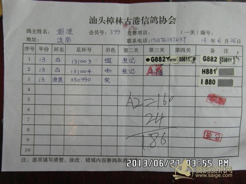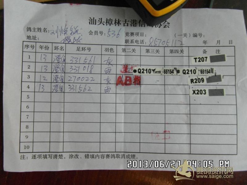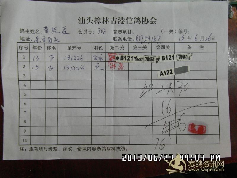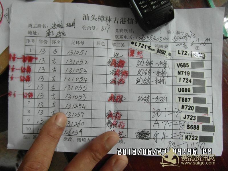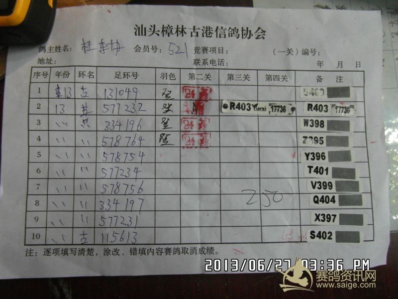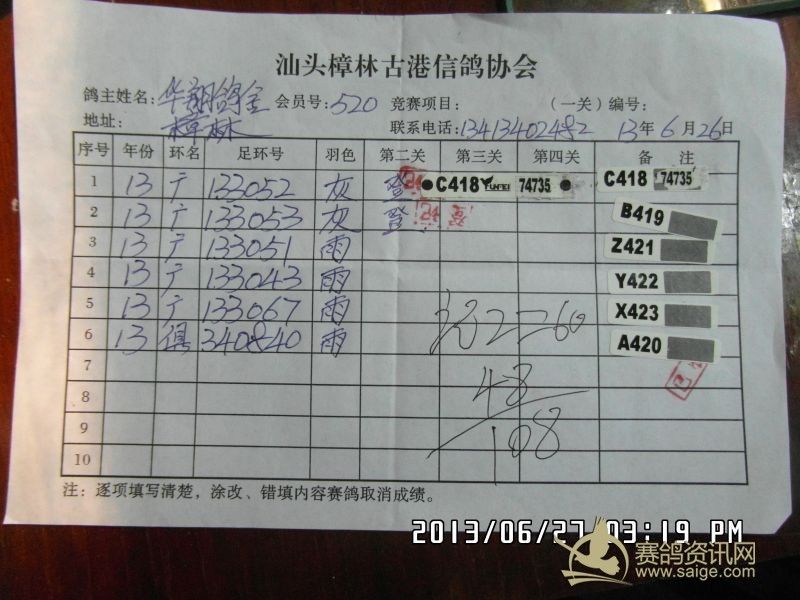 樟林古港信鸽协会2013年夏季福州站决赛幼鸽赛,常规赛前三名验鸽图片