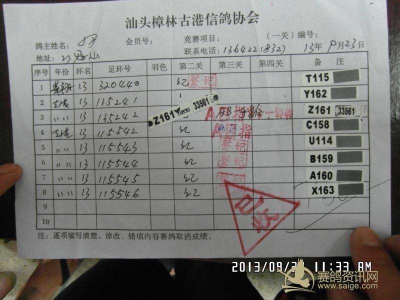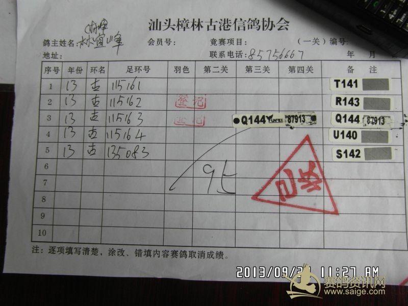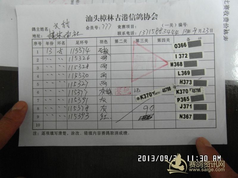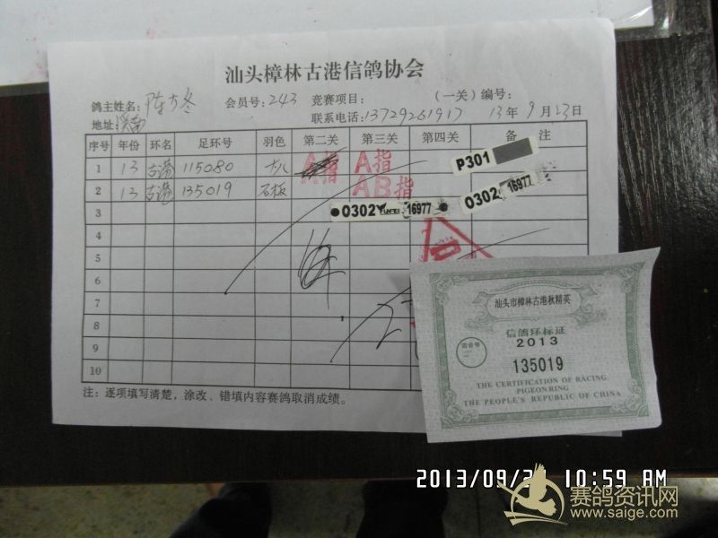 樟林古港信鸽协会2013年秋赛福清站比赛福清精英幼鸽赛,平阳幼鸽预赛前三名验鸽图片