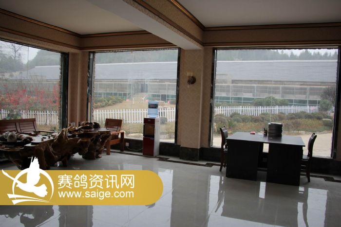 图为翠枫园赛鸽中心董事长姜军(右一)与翠枫园赛鸽中心管理人员宋泳江(左二)、高正黔(左一)在观赛大厅品茶聊天