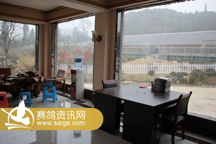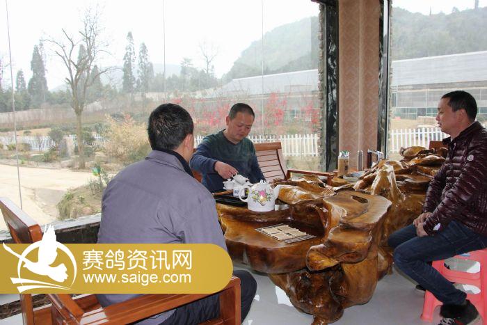 图为翠枫园赛鸽中心董事长姜军(右一)与翠枫园赛鸽中心管理人员宋泳江(左二)、高正黔(左一)在观赛大厅品茶聊天