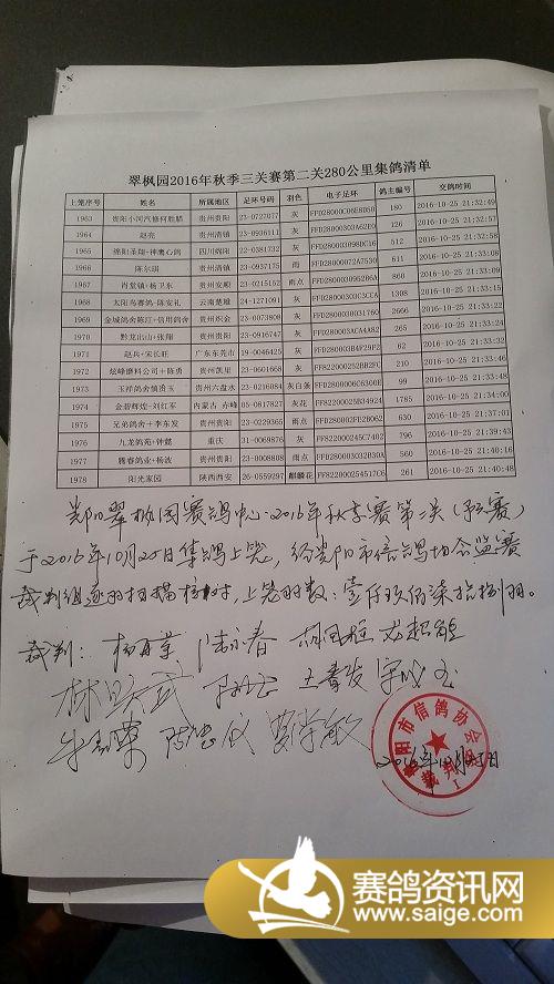 翠枫园2016年10月25日280公里集鸽清单