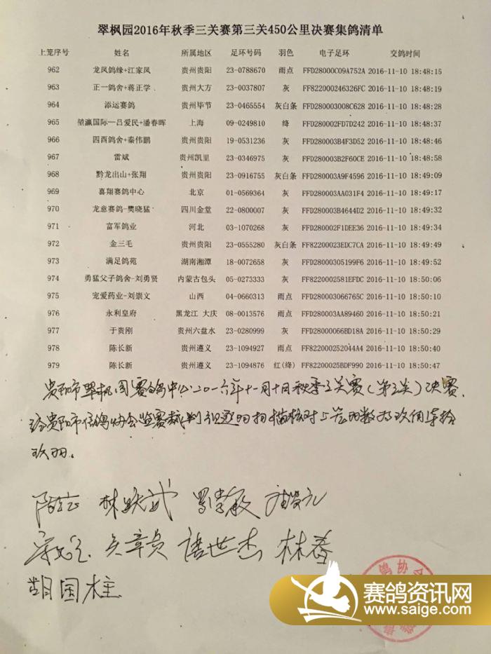 翠枫园2016年秋季三关赛第三关450公里决赛集鸽清单