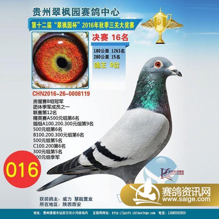 ▲翠枫园2016年秋赛,来自于陕西威力公司总经理霍新余的决赛16名即鸽王9位,经过12次竞价,拍出了全场也是当年贵州公棚的最高价——35万!这羽鸽子,作为团体季军功臣之一,越战越勇,为鸽主赢得了多项指定奖项以及清镇市“中环国际”项目110平方住宅一套!