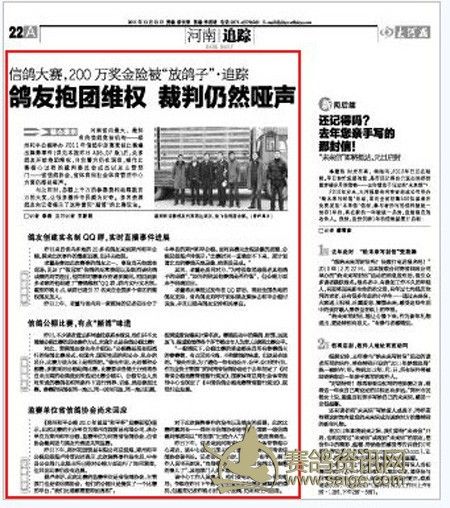 另据郑州市金水区人民法院有关人士透露,此案案发后,宋国锋曾于今年1月份委托律师到法院递交了民事起诉状,起诉此次比赛的主办单位——郑州和平公棚以及河南省信鸽协会,以无理取消其成绩而要求对方兑付奖金,但随后宋国锋撤诉。