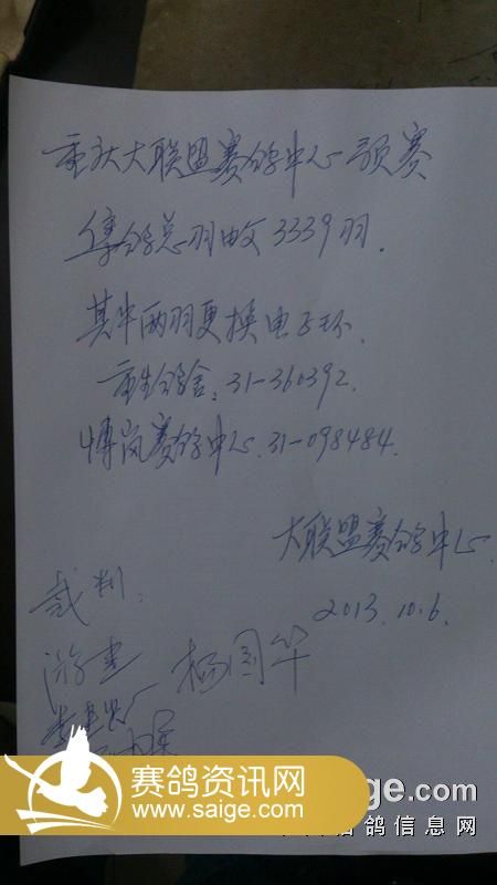 重庆大联盟赛鸽中心2013年预赛数据裁判签字