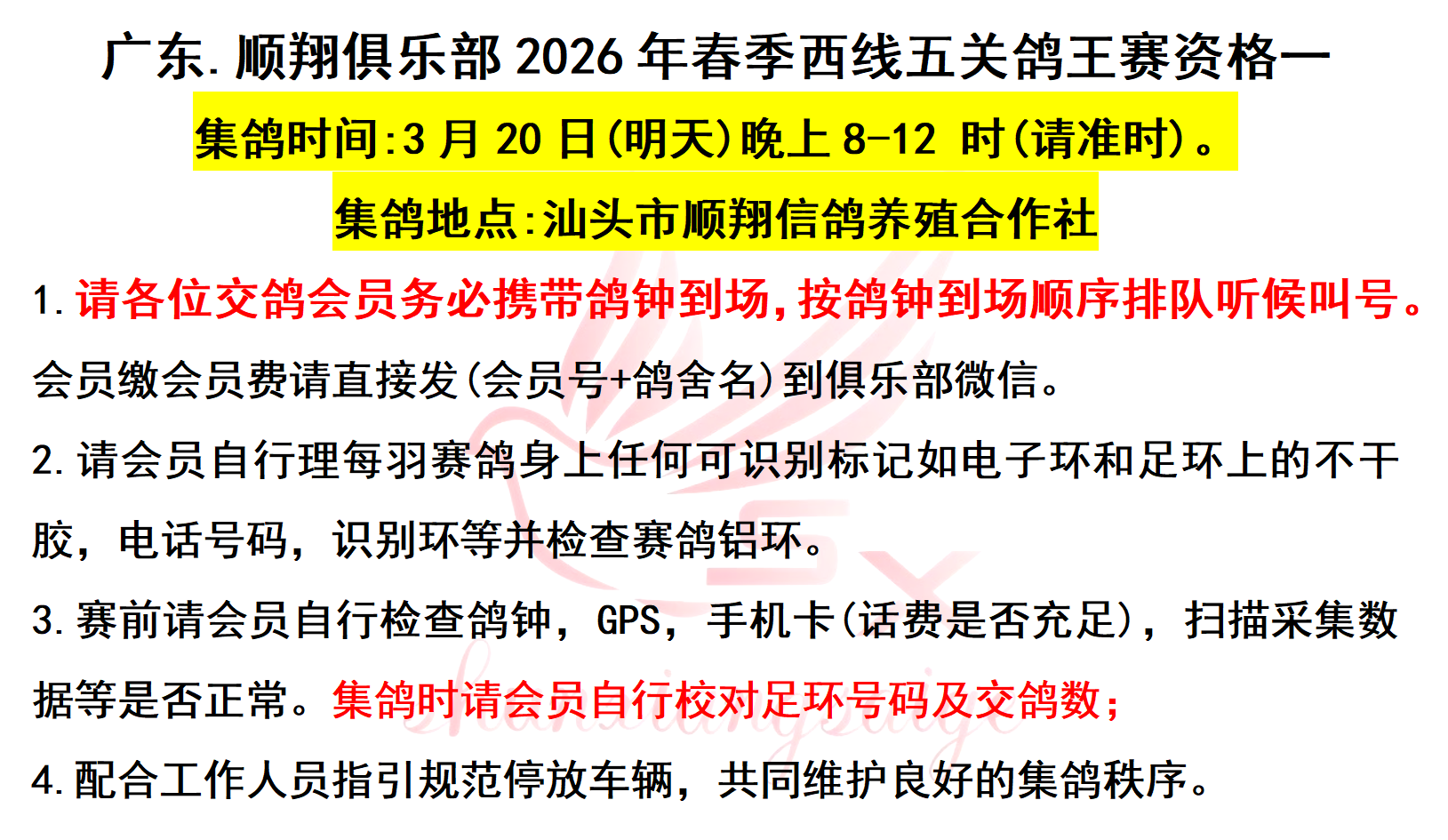 广东.顺翔俱乐部2026年春季西线五关鸽王赛资格一,集鸽时间为:3月20日(明天)晚上8-12 时(请准时)。