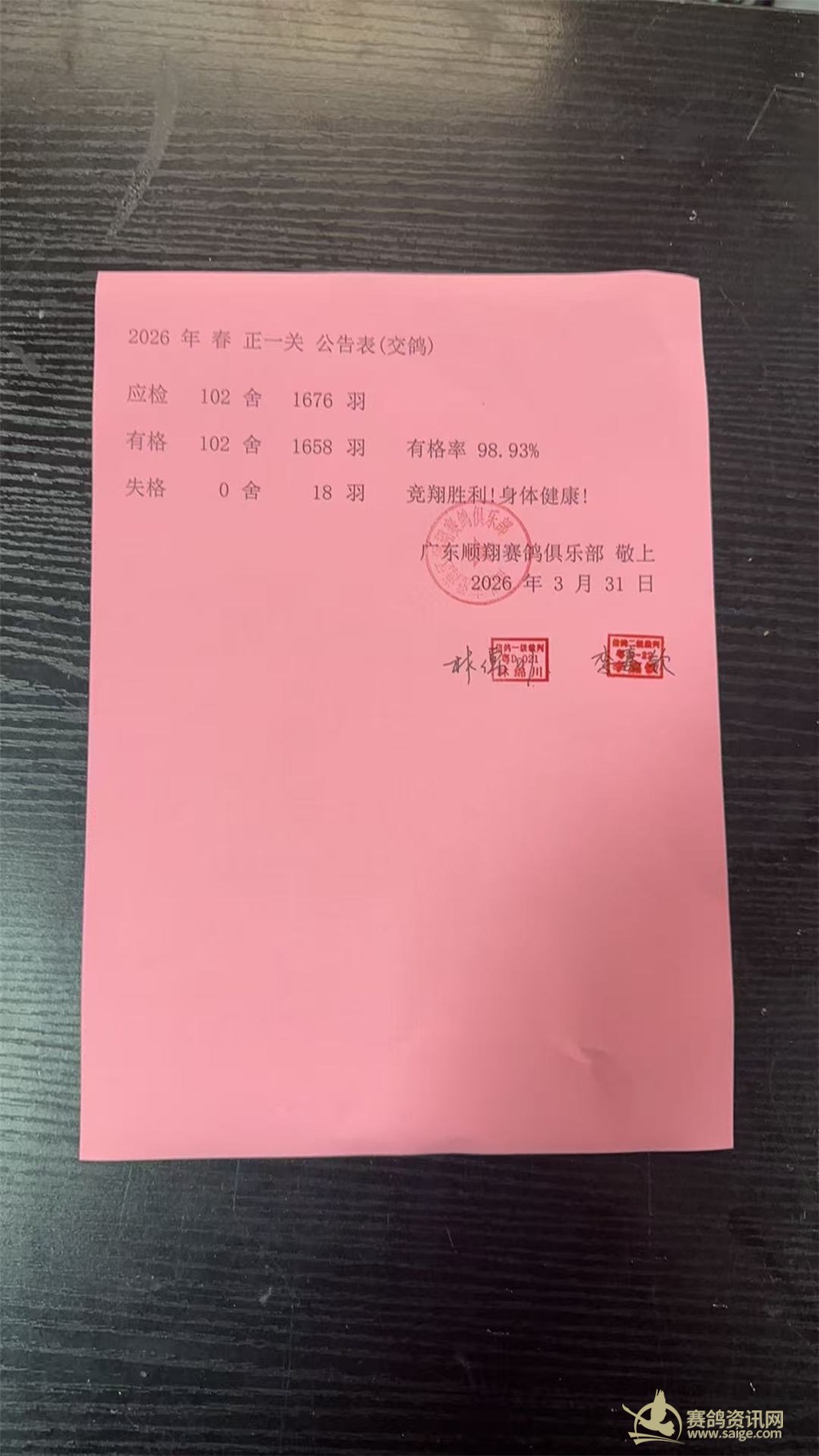 广东汕头市顺翔俱乐部2026年春季西线五关鸽王赛正一关上笼明细
