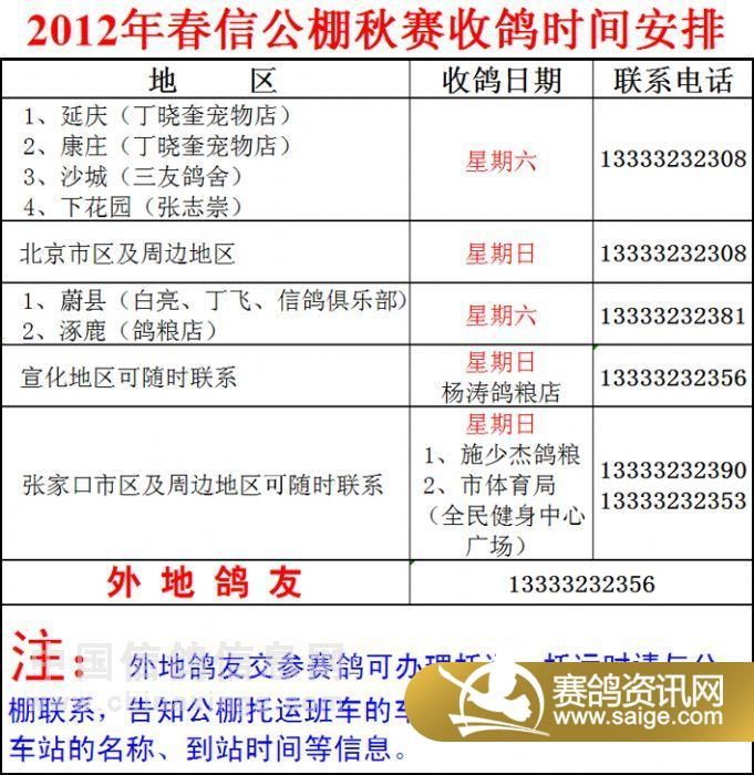 春信公棚2012年秋赛收鸽计划安排