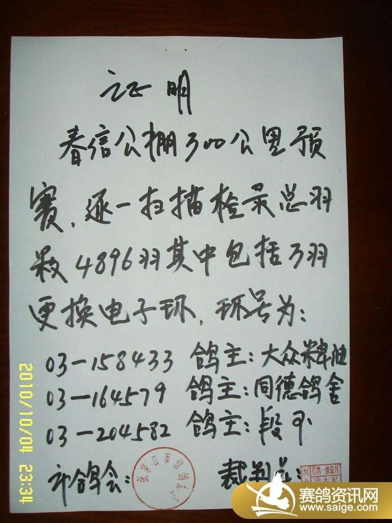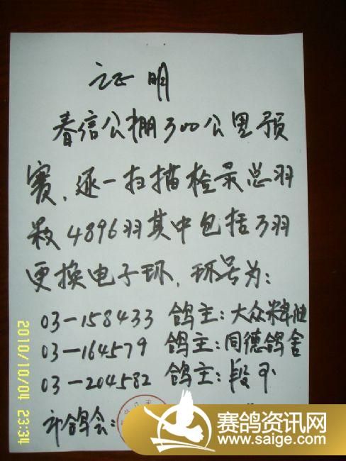 张家口春信公棚300公里预赛集鸽数据