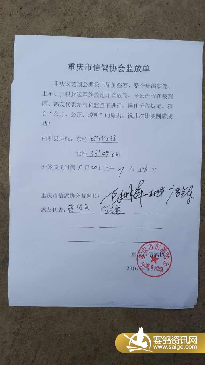 重庆宏艺翔公棚第三届加强赛,于7:56开笼,经度:105.19.536 纬度:33.49.061 空距:483公里 司放地:西和县。天气:晴。网络直播与短信同步。感谢您的关注与支持!预祝您取得好的成绩!