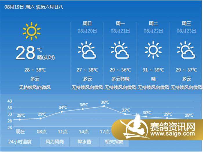 尊敬的会员鸽友,为了选择适合的天气对爱鸽进行训养,让鸽友们能随时掌握宏艺翔天气情况,重庆宏艺翔公棚特提供未来一周的天气预报供鸽友参考(8月19日及未来一周天气预报)。