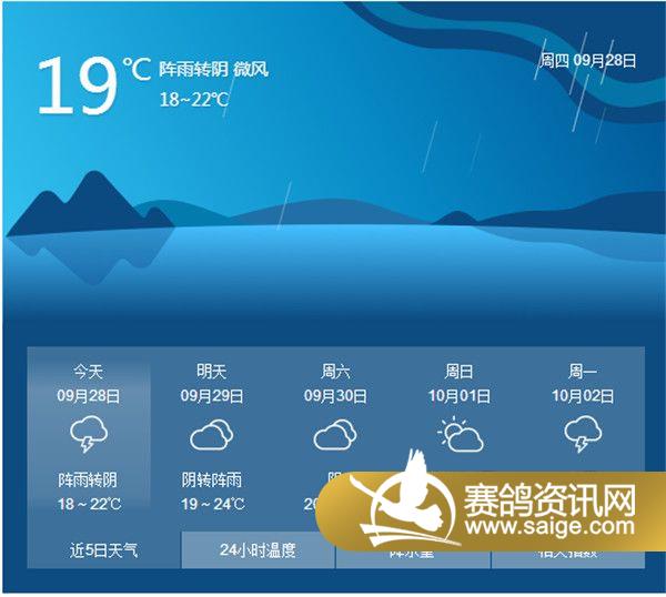 尊敬的会员鸽友,为了选择适合的天气对爱鸽进行训养,让鸽友们能随时掌握宏艺翔天气情况,重庆宏艺翔公棚特提供未来一周的天气预报供鸽友参考(9月28日及未来一周天气预报)。