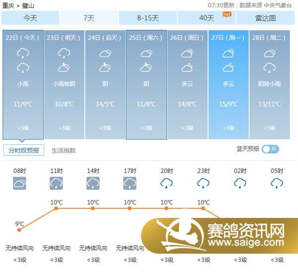 尊敬的会员鸽友,为了选择适合的天气对爱鸽进行训养,让鸽友们能随时掌握宏艺翔天气情况,重庆宏艺翔公棚特提供未来一周的天气预报供鸽友参考(11月22日及未来一周天气预报)。