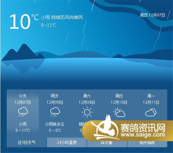 尊敬的会员鸽友,为了选择适合的天气对爱鸽进行训养,让鸽友们能随时掌握宏艺翔天气情况,重庆宏艺翔公棚特提供未来一周的天气预报供鸽友参考(12月7日及未来一周天气预报)。