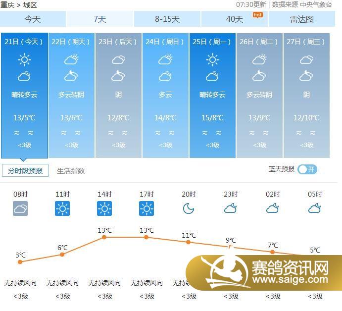 尊敬的会员鸽友,为了选择适合的天气对爱鸽进行训养,让鸽友们能随时掌握宏艺翔天气情况,重庆宏艺翔公棚特提供未来一周的天气预报供鸽友参考(12月21日及未来一周天气预报)。