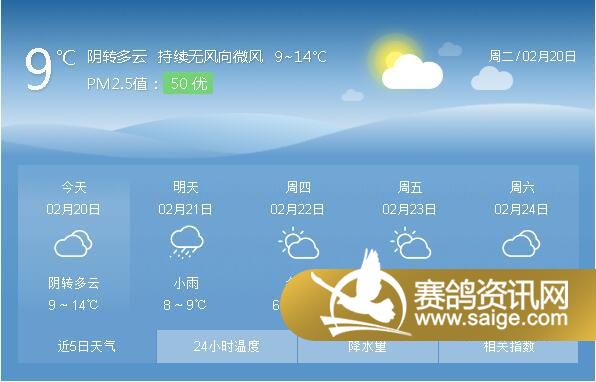 尊敬的会员鸽友,为了选择适合的天气对爱鸽进行训养,让鸽友们能随时掌握宏艺翔天气情况,重庆宏艺翔公棚特提供未来一周的天气预报供鸽友参考(2月20日及未来一周天气预报)。