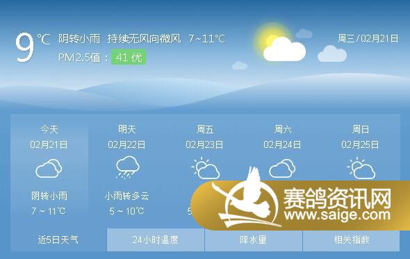 尊敬的会员鸽友,为了选择适合的天气对爱鸽进行训养,让鸽友们能随时掌握宏艺翔天气情况,重庆宏艺翔公棚特提供未来一周的天气预报供鸽友参考(2月21日及未来一周天气预报)。