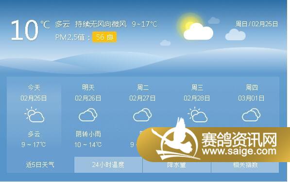 尊敬的会员鸽友,为了选择适合的天气对爱鸽进行训养,让鸽友们能随时掌握宏艺翔天气情况,重庆宏艺翔公棚特提供未来一周的天气预报供鸽友参考(2月25日及未来一周天气预报)。