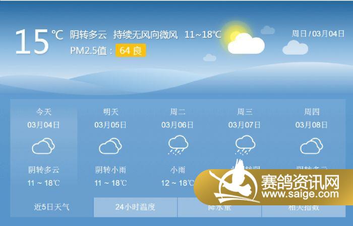 尊敬的会员鸽友,为了选择适合的天气对爱鸽进行训养,让鸽友们能随时掌握宏艺翔天气情况,重庆宏艺翔公棚特提供未来一周的天气预报供鸽友参考(3月4日及未来一周天气预报)。