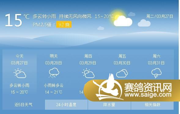 尊敬的会员鸽友,为了选择适合的天气对爱鸽进行训养,让鸽友们能随时掌握宏艺翔天气情况,重庆宏艺翔公棚特提供未来一周的天气预报供鸽友参考(3月28日及未来一周天气预报)。