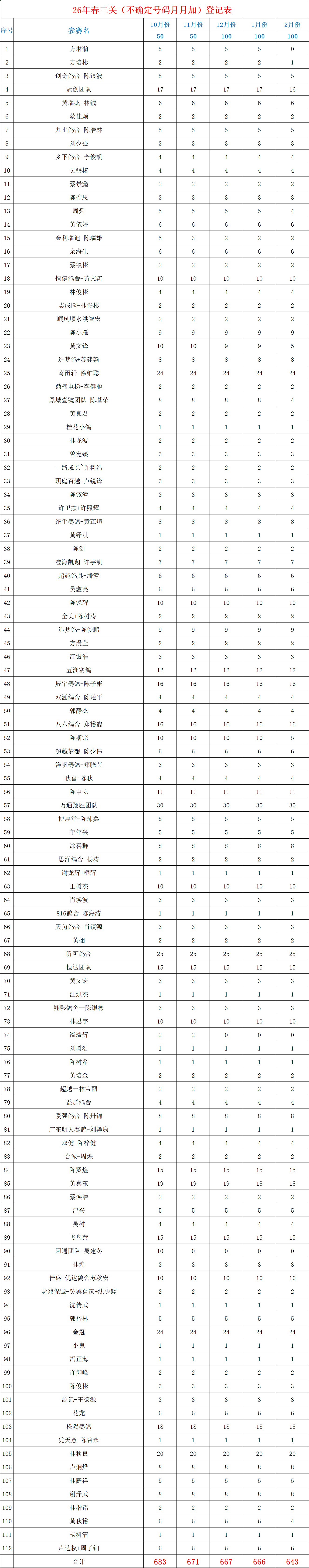 恒翔信鸽协会2026春夏季三关赛(配对技能不确定月月加)1月份名单