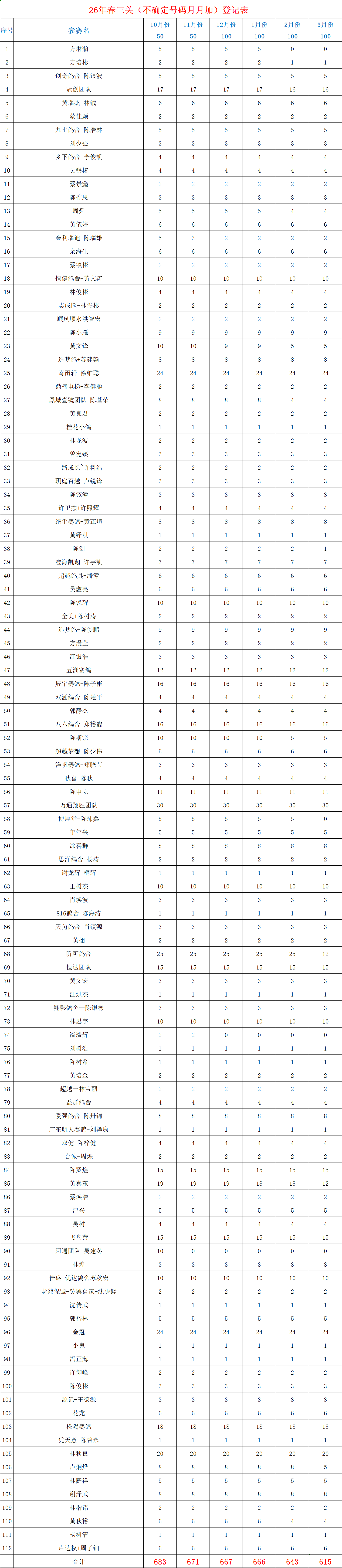 恒翔信鸽协会2026春夏季三关赛(配对技能不确定月月加)1月份名单