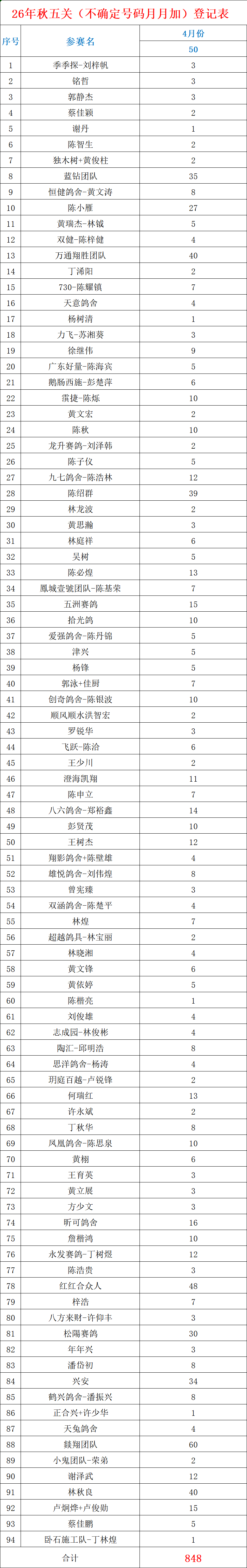 恒翔信鸽协会2026秋季五关赛(配对技能不确定月月加)4月份名单