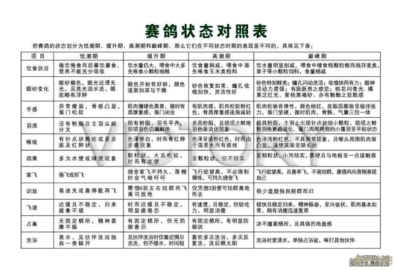 赛鸽状态跟行为表现对照表