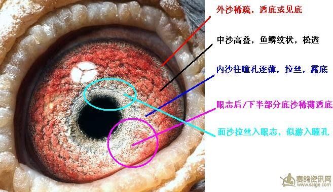 沙眼+面沙松透+带黑气+底沙面沙反差大+眼前角带血影=全能鸽