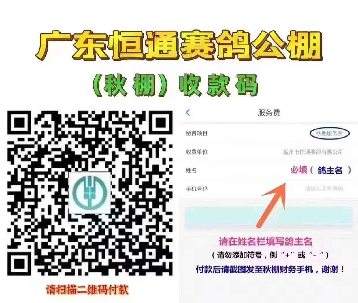 请扫描以下二维码,填写支付金额,并在“备注 ”里填写清楚鸽 主参赛名,付款成功后截图发给恒通文员:小金(15018101388)、