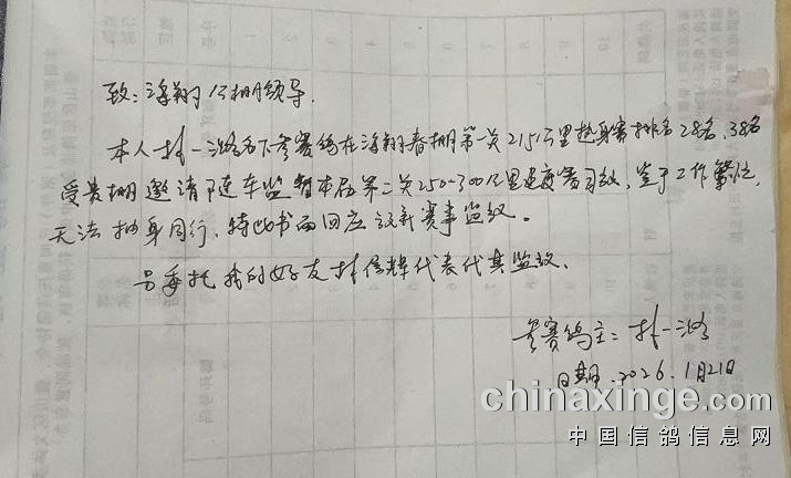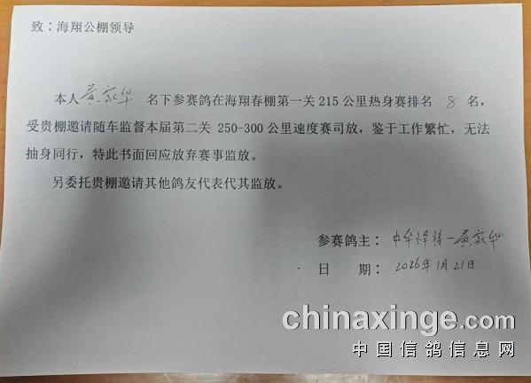 广东海翔(春棚)2026年第二关250-300公里速度赛定于2026年1月22号下午15点开始集鸽,1月23号早上开笼。由广东省鸽协委派裁判长、汕尾市裁判组进行逐羽扫描、盖章、核对环号与羽色、佩戴定位环、监放等工作