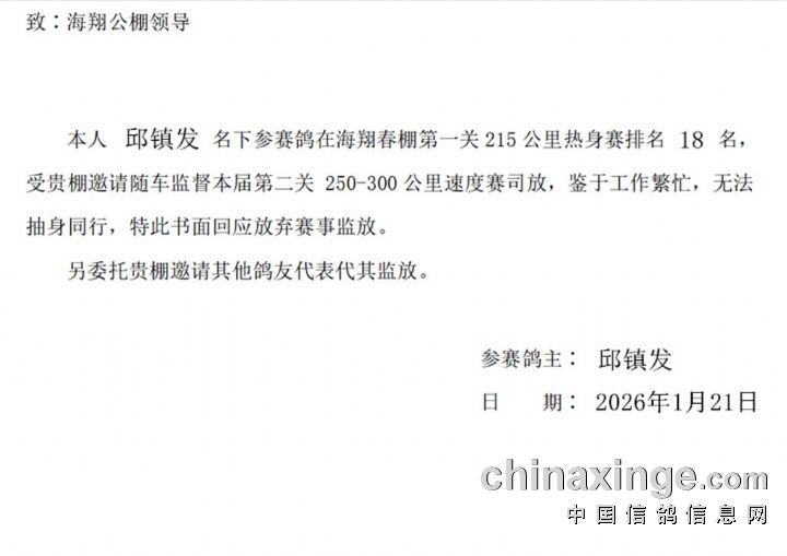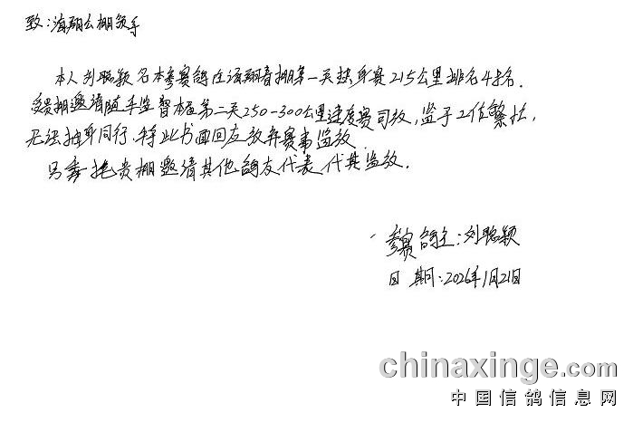 根据2026年竞赛章程速度赛时需邀请热身赛第8名18名28名38名48名58名68名78名88名98名的鸽主监督入笼及随车放飞全过程,以下为监放鸽友的名单: