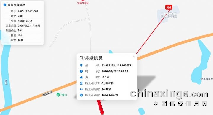 后续都是在道路上移动,直到23日17:09:52在海翔春棚附近后山村道路上移动,该羽赛鸽于23日17:18:53归巢。