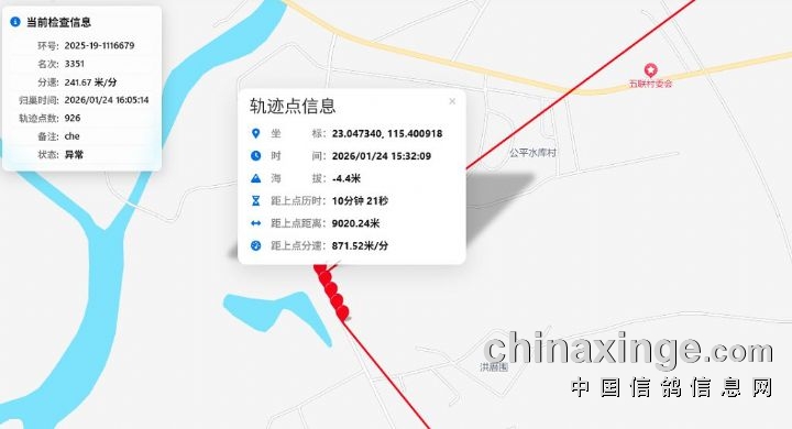 后续都是沿道路移动,于24日14:14:19在海丰县平东镇附近沿道路移动。赛鸽于14:40:22归巢。